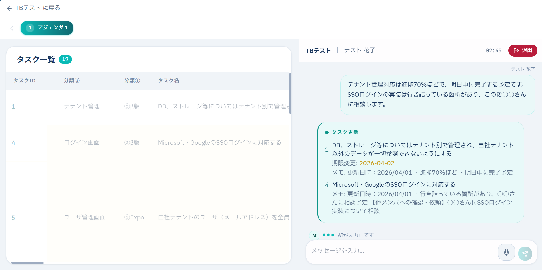 会議終了5分後に議事録メールを自動配信。進捗管理ExcelもタスクID単位で自動更新されます。